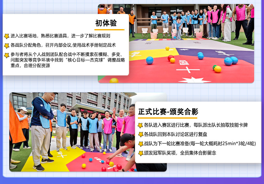参与者分队组建3支球队,每支球队由6-7人组成,在只能使用双手和上半身力量的情况下,三支团队在同一个赛场上进行“非对抗类”对抗比赛,最终决出胜负。